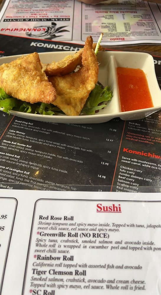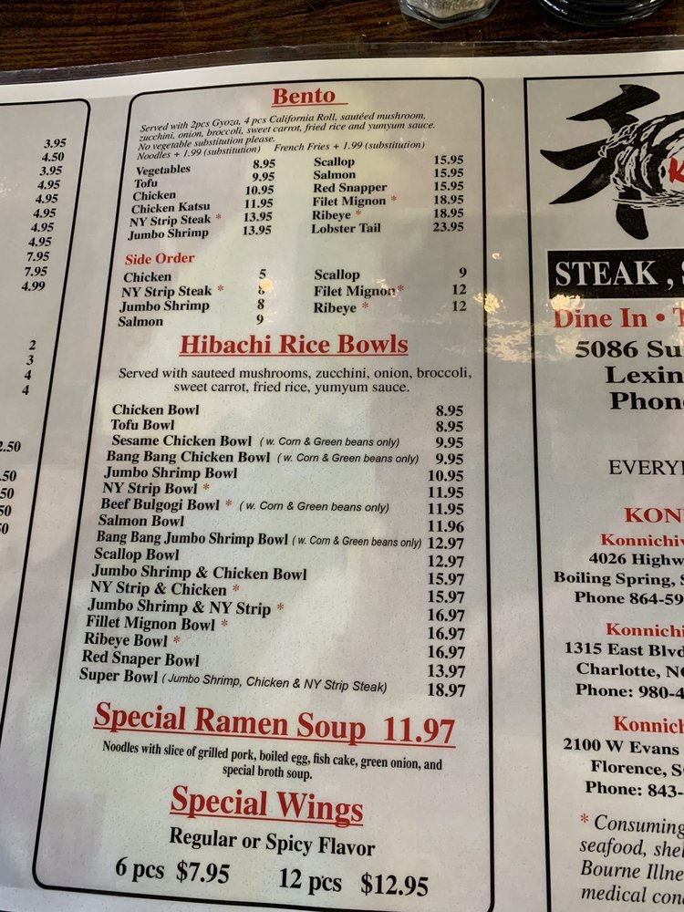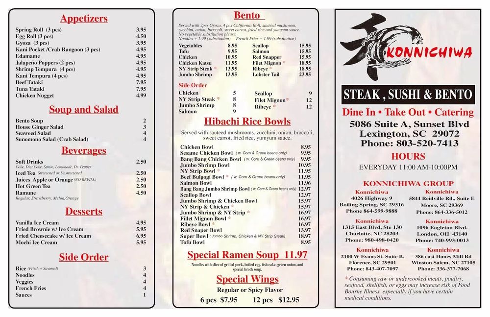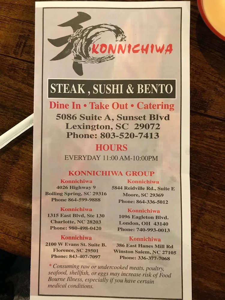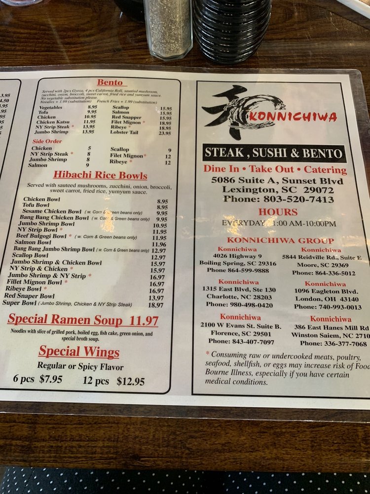 Konnichiwa is a Japanese Sushi Bar located on 5086 Sunset Blvd Ste A in Lexington, SC. Known for its fresh sushi rolls and attentive staff, customers rave about the delectable food and enjoyable ambiance. With a variety of options, including vegetarian dishes and a recommended Papa Roll, Konnichiwa offers excellent service and generous portion sizes. Customers praise the friendly and accommodating staff, along with the top-tier service that goes above and beyond. The bento box, priced at $14, is a popular choice with quality food that exceeds expectations. With a pleasant atmosphere and thoughtful touches like extra condiments and water for takeout, Konnichiwa provides a superior dining experience that is worth returning for.